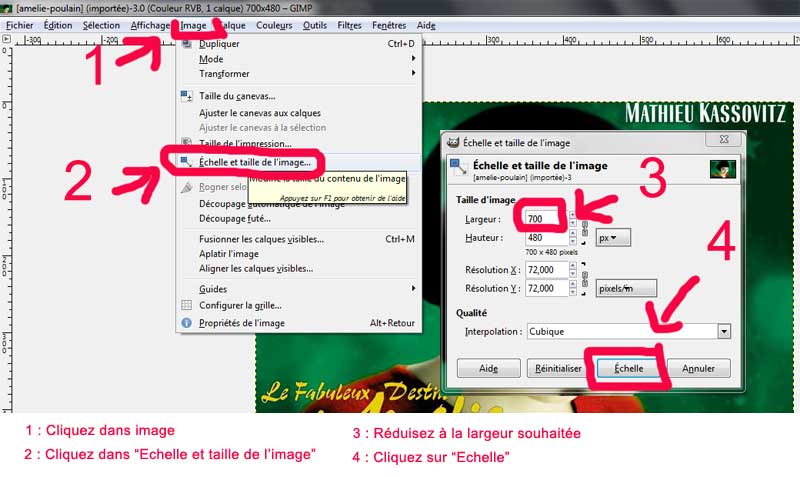 Ouvrez donc la copie de votre image dans votre logiciel de retouche photo et dans le menu Image, cherchez la fonction Taille de l’image ou Redimensionner. Vérifiez que la case Conserver les proportions est bien cochée et saisissez la nouvelle largeur de votre image, en pixels. La hauteur s’ajustera automatiquement.