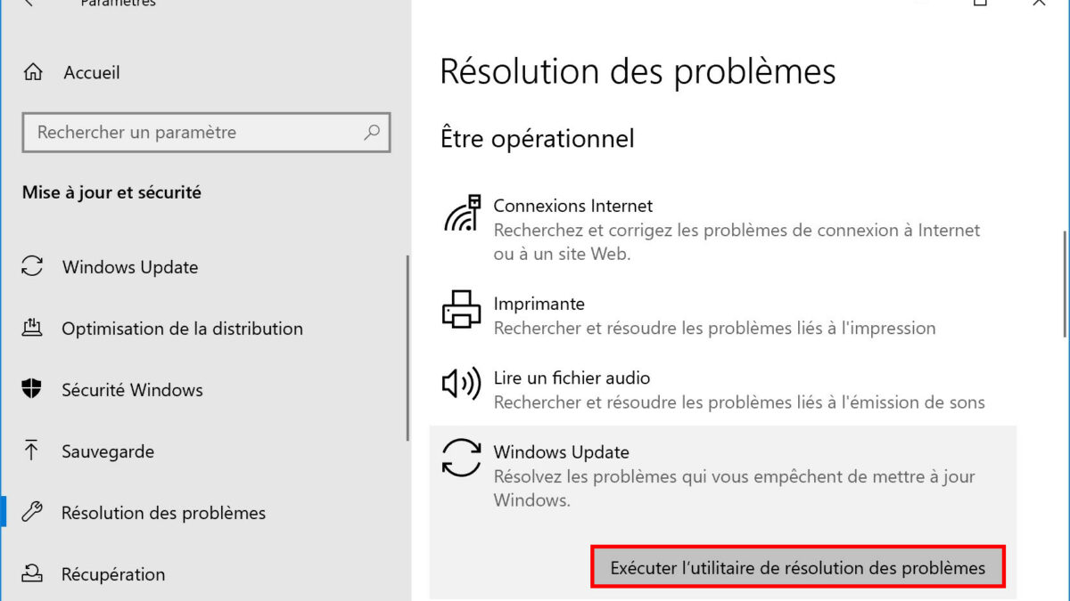 Sur Windows 10 : ouvrez les Paramètres > Mise à jour et sécurité > Résolution des problèmes. Sélectionnez Windows Update > Exécuter l’utilitaire de résolution des problèmes.