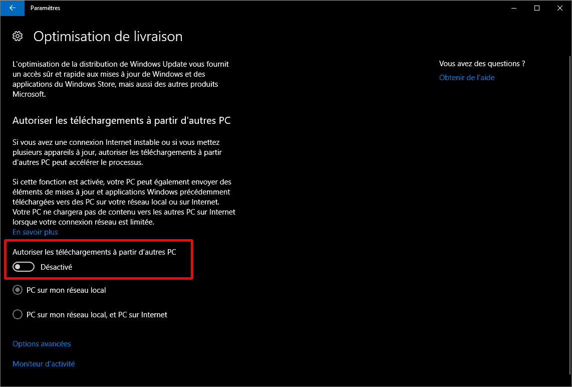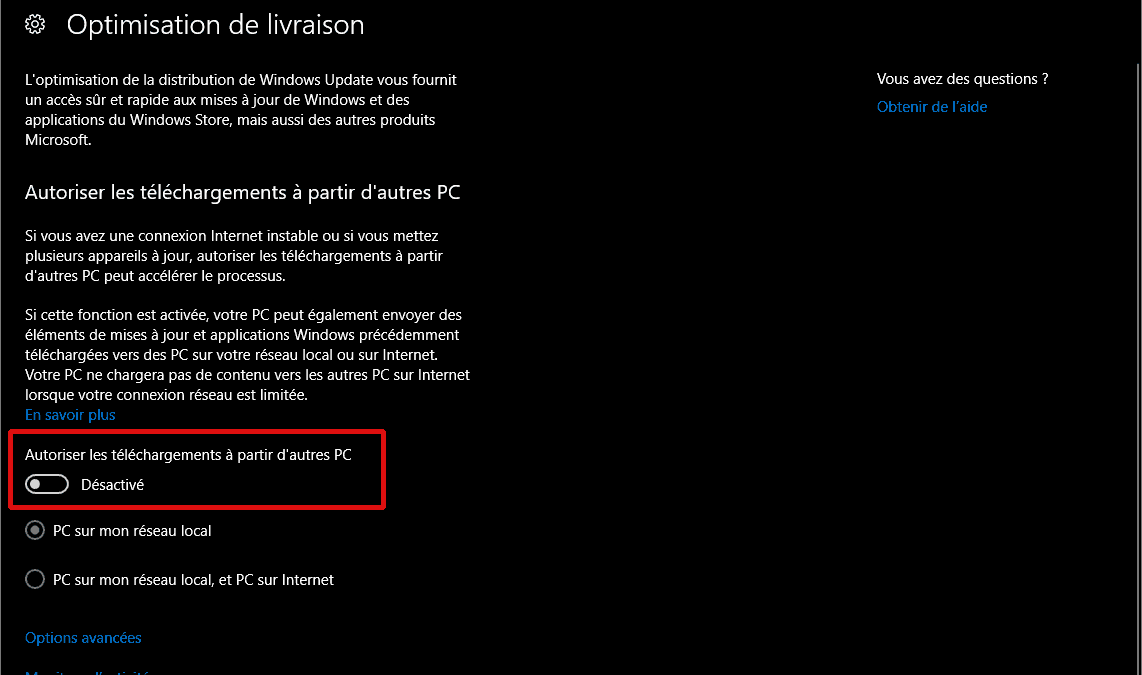 Vous pouvez désactiver entièrement cette fonctionnalité.Cependant, si vous avez plusieurs ordinateurs Windows 10 sur votre réseau local, activez le partage et sélectionnez PC sur mon réseau localCela accélérera la distribution des mises à jour de Windows 10 et évitera de télécharger plusieurs fois la même mise à jour.