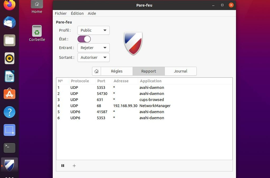 Gufw vous permet de gérer des profils de règles (par exemple, domestiques ou publics) et fournit un petit assistant pour générer automatiquement des règles à partir d’une liste de services en écoute sur le système.