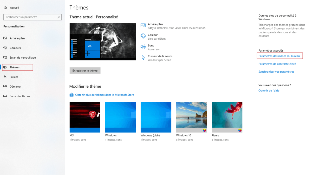 - Cliquez sur le menu de gauche thème puis sur Paramètres de l’icône du bureau.