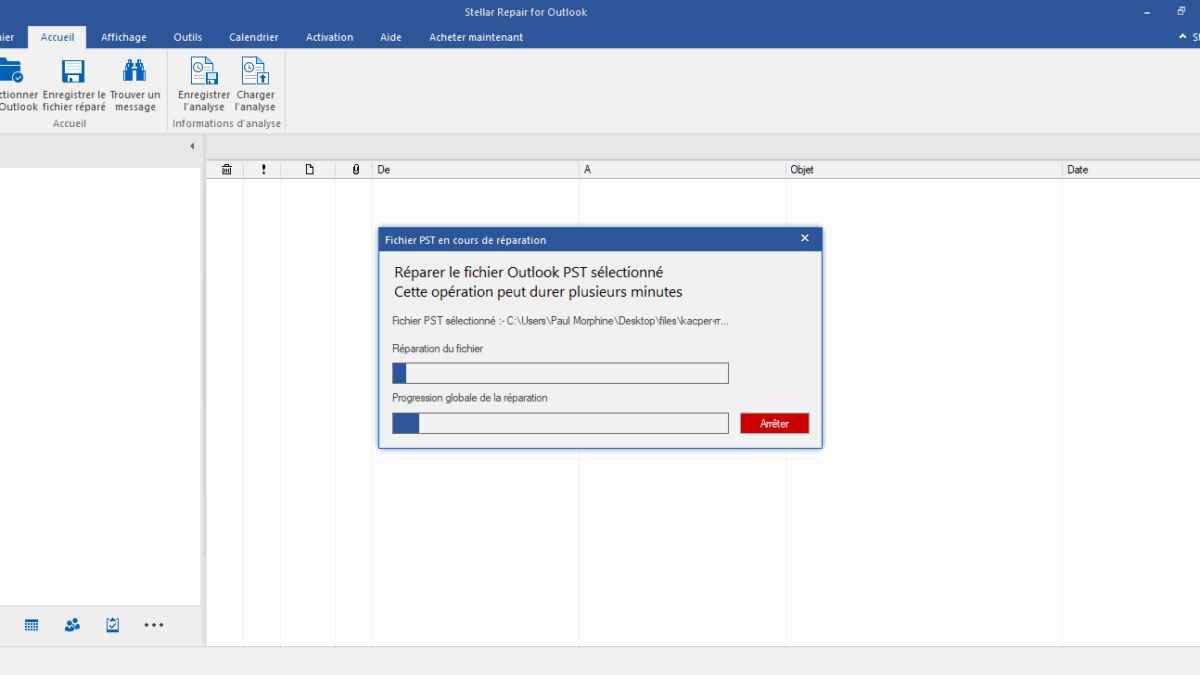 Remarque : Selon la taille et la gravité des dommages, le logiciel peut prendre un certain temps pour analyser le fichier PST endommagé. Vous pouvez choisir d’arrêter le processus d’analyse à tout moment en cliquant sur le bouton “Arrêter” dans la boîte de dialogue de réparation du fichier PST.