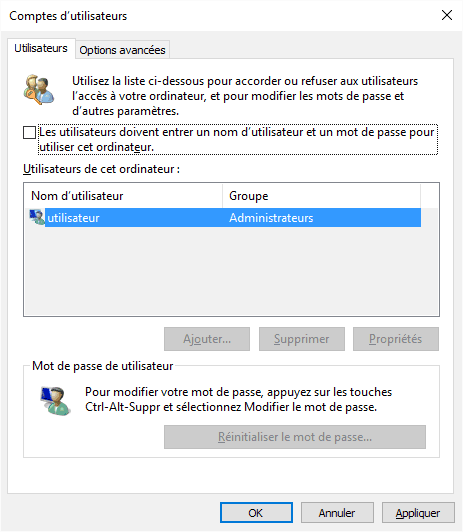 - Dans la fenêtre Comptes d’utilisateurs, décochez la case L’utilisateur doit entrer un nom d’utilisateur et un mot de passe pour utiliser cet ordinateur“.