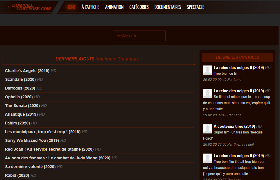 domicilecoifeuse est un site de streaming gratuit pour regarder des films complets sans pub et en films français en haute définition, il propose une large sélection comme de l’action, de l’aventure, des spectacles, de la comédie. … parfois il est bloqué car il ne fonctionne plus à cause de plusieurs critères, a changé le nom, s’est bloqué, mais heureusement il existe des sites similaires.