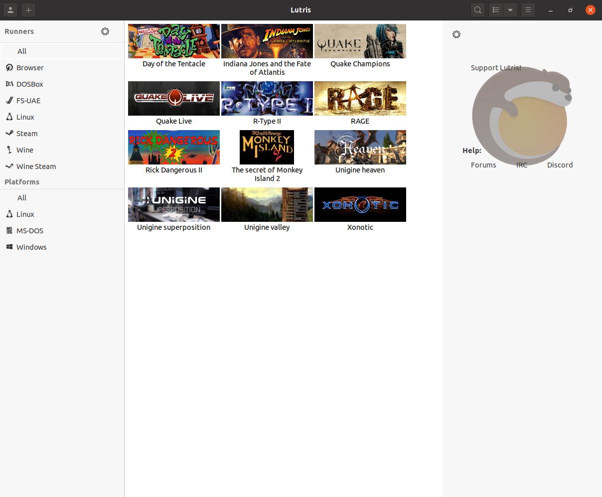 Blague à part, Lutris s’appuie sur ce qu’il appelle des “runners” (qu’on peut traduire par “performers”). Ce sont eux qui gèrent les programmes du jeu, ils ne font pas partie du projet Lutris, mais Lutris sait les piloter, et même les installe lui-même si nécessaire. Il y a beaucoup de choses que Lutris peut gérer ; nous pouvons trouver des clients Linux Steam natifs, divers émulateurs de console, des émulateurs pour des systèmes d’exploitation plus anciens tels que DOS, et même un exécuteur de jeu spécifique à Windows, Wine, tel qu’un client Steam qui prend en charge l’installation de Windows . Cette liste n’est pas exhaustive.