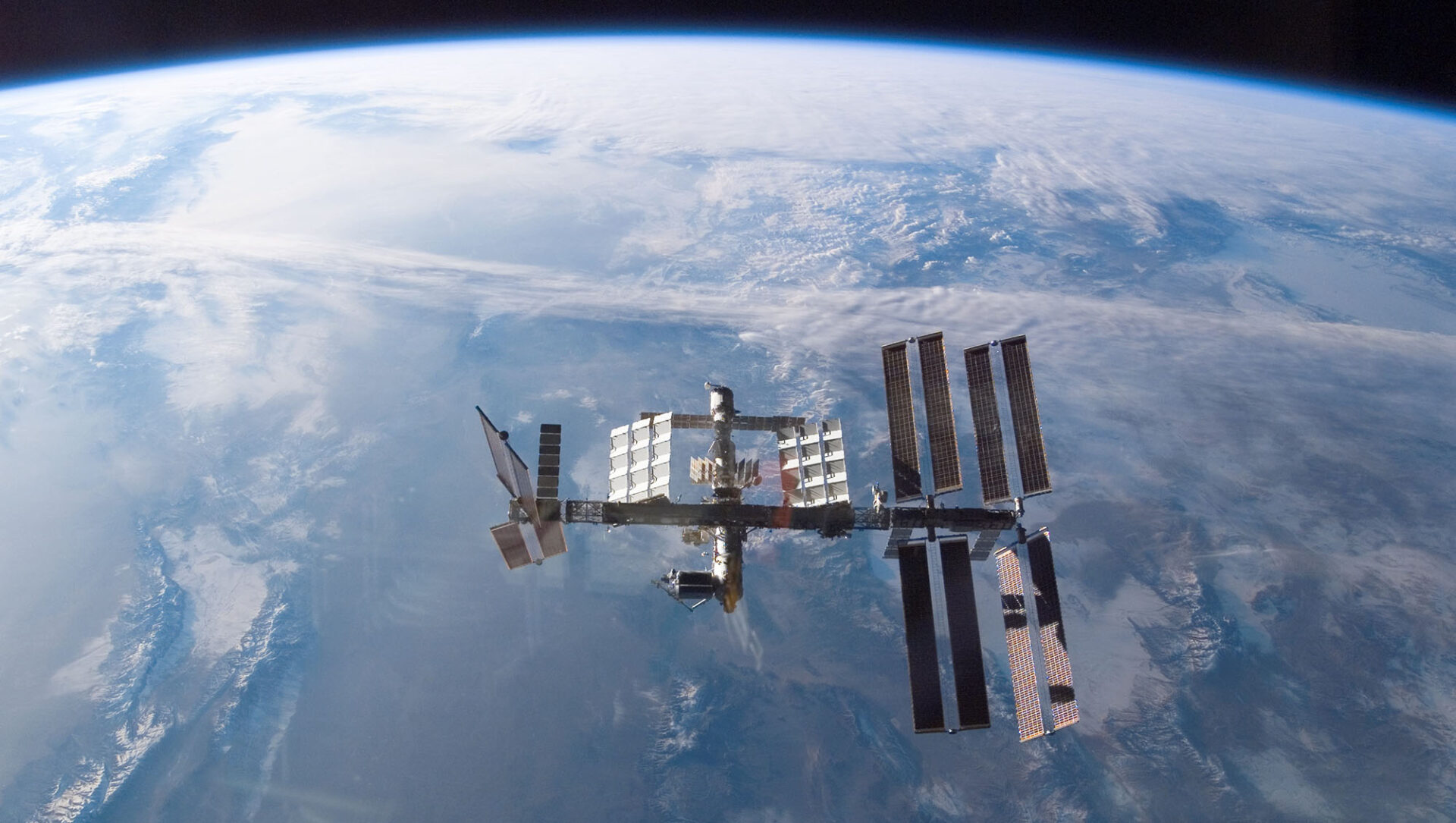 La Station spatiale internationale (ISS), laboratoire international en orbite. Orbitant dans l’espace aux alentours de 400km autour de la Terre, l’ISS tourne à près de 8km/s et fait ainsi quinze fois le tour de la planète par jour.