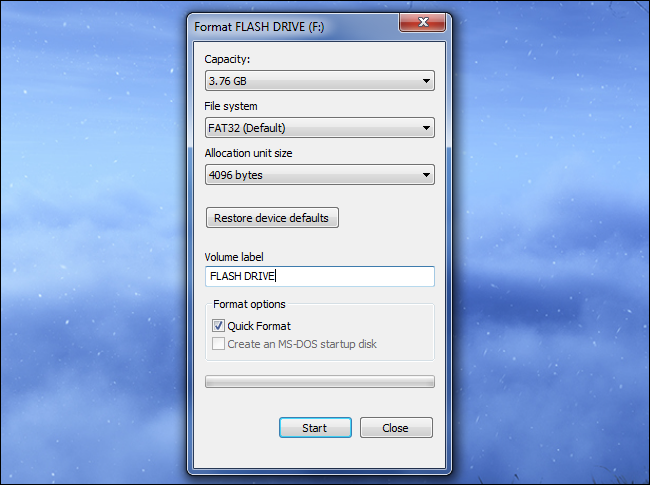 - Click Start. If the File system isn’t listed as FAT32, click on the drop-down menu and choose it.